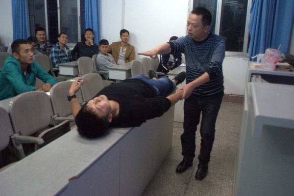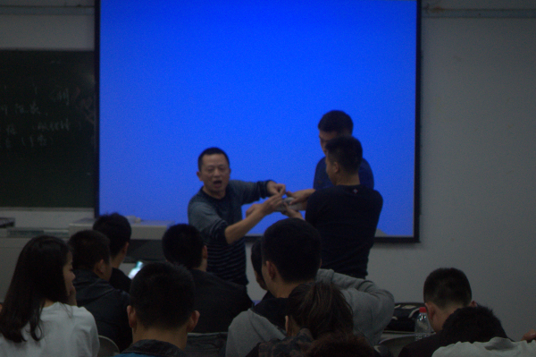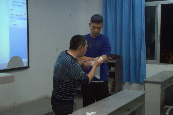 谢健生老师首先讲授了运动中突发骨折、扭伤的应急处理,因为篮球运动非常容易受伤,有各种受伤,比如有骨折受伤,脚跟歪伤,手指扭伤等,这些伤都需要学篮球的同学去了解,如何处理现场的问题,需要用正确的方法去处理受伤的部位,减少对运动员的伤害。接着,介绍了全身各个关键部位的处理和解决,教员工用手脚的手法去解决骨头脱臼的问题等,而现场谢健生老师还为大家做了如何解决骨头脱臼的问题,现场气氛十分热烈,做的实验很有吸引力。最后,谢健生老师还进行了腕、肘、踝、膝关节的绷带包扎的实际操作。