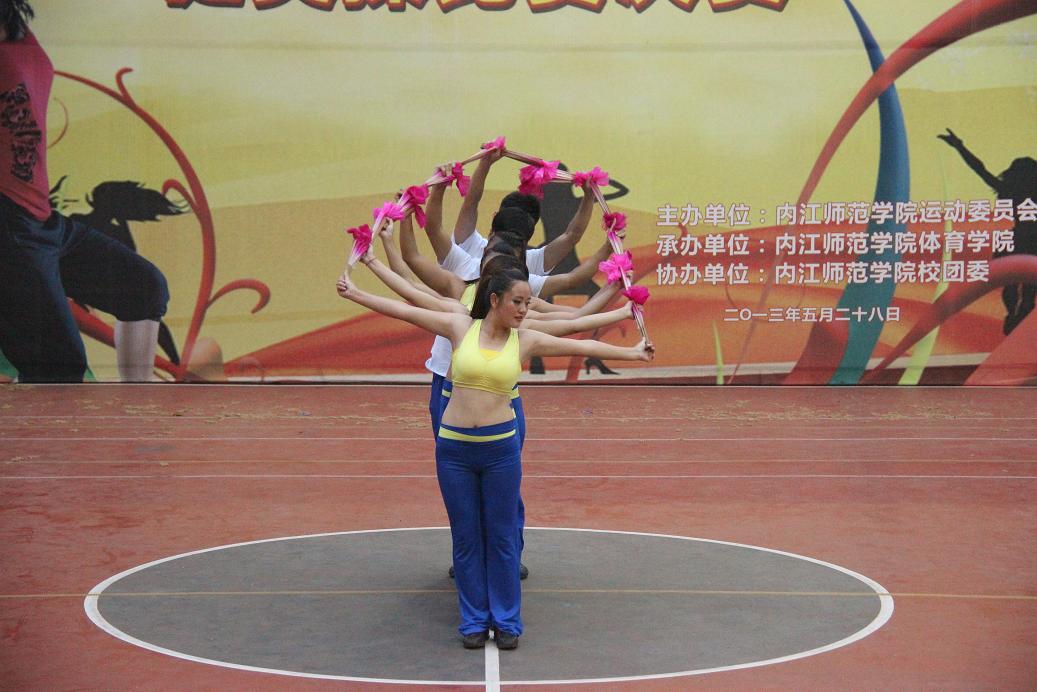 28名健儿带来精彩刺激的技巧啦啦操拉开了本次决赛的帷幕。健儿们呼着“激情似火,舞动青春,创造辉煌”的口号来到赛场上,洪亮的口号声让观众们感受到了新葡的京集团8814莘莘学子的活力与激情。他们整齐的在舞台中散开,每一个动作都体现了他们扎实的功底;无论是头颈、上肢、胸部、腰部还是下肢等部位的动作都与音乐紧密结合,完成了力量与柔美的交接;更是大秀专业技巧,上演高难度的空中“飞人大战”。甲组女子特色操、自编操、大众六级体操、竞技健美操规定套路、少儿三级、带操等让观众移不开眼睛。