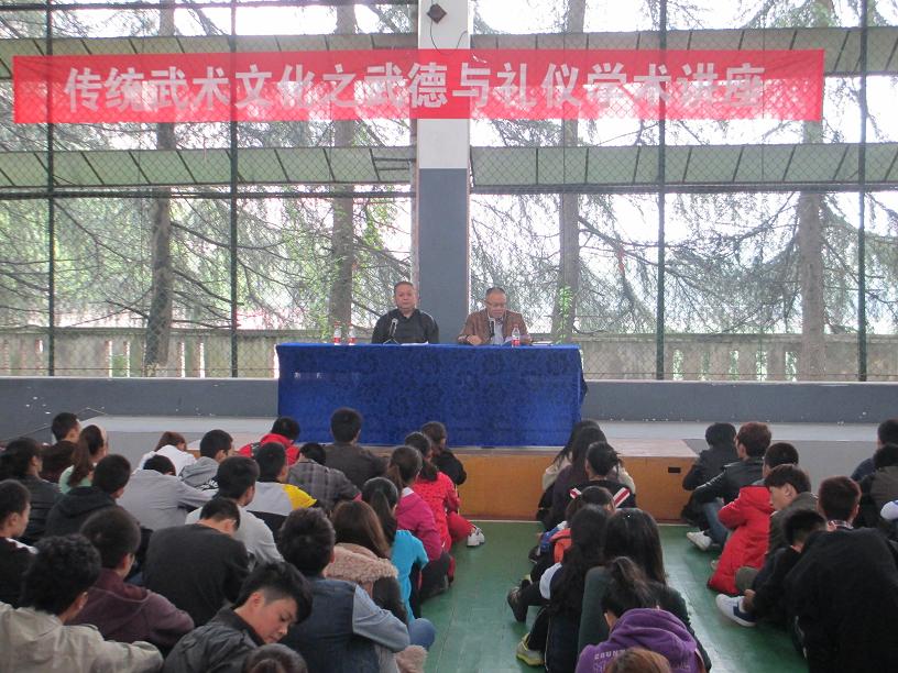 在主持人简短的开场白之后,尤再清教授便切入正题,他以诙谐幽默的语言从中国传统武术、四川传统武术、内江传统武术这三方面对传统武术的概况进行了介绍与分析。他指出:中国传统武术历史悠久,它“起于易、成于医、附于兵、扬于艺”。并从一击、一刺、一拳、一腿等方面介绍了查拳、华拳、红拳、少林拳等主要的拳种体系;详细区分了素有“南拳北腿”之分的武术的不同特点。四川传统武术尤以“一树开五花,五花八叶扶”著称的峨眉武术见长,并详细地介绍了武术近代传入四川的过程,以及内江传统武术的发展。