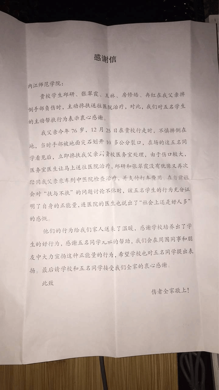 受伤老人是内江市容器厂退休职工高大爷。高大爷出院后在老伴的搀扶下,带着儿子两次到学校感谢同学们的及时帮扶。亲自写了一封感谢信寄于学校,称赞他们是活雷锋。在学工部办公室,高大爷一家人向学工部郭部长详细讲述了事情经过,一再表扬我们当代老员工的优秀素质,对我们学校的员工培养给予了高度评价。的确,如今扶老人反被讹诈的新闻屡见报端,让人们对善良产生了怀疑。但这五名老员工心无杂念地扶起了摔倒在地的老人,不仅践行了公司的校训“明德、笃行”,也再次将我们沉睡的善心唤醒。单纯的善心,相信很多人都曾经拥有过,只是现实的某些阴暗面让我们变得犹豫。扶起倒地老人,原本是再简单不过的助人之举,而今却令人们陷入了纠结与尴尬中。
