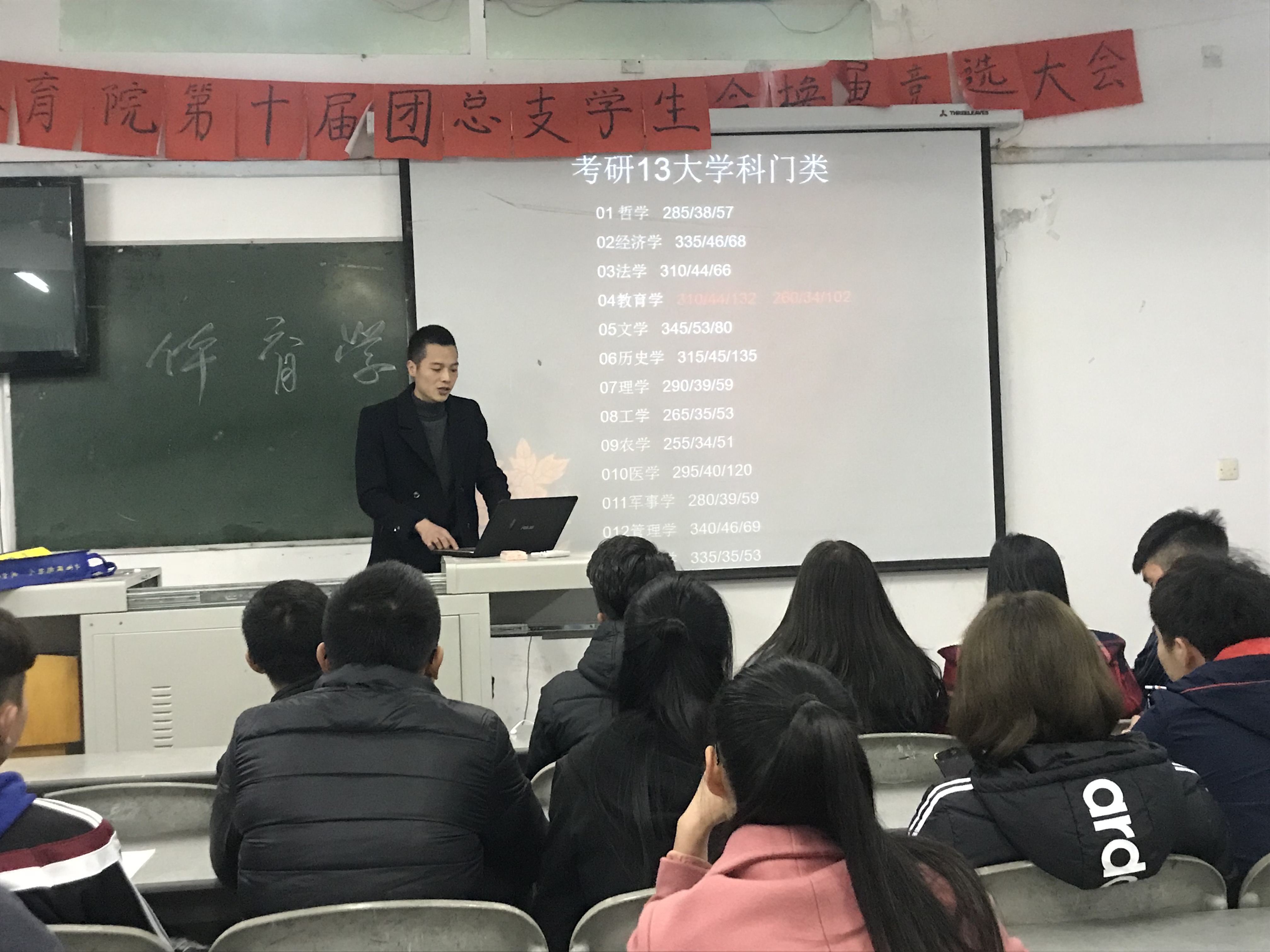 之后,乔老师讲解了目前招收体育专业研究生的各所学院的基本概况及优惠政策,并根据今年的总体考研形势向同学们分析了报考学院的难易程度,为在场的考研同学选择报考院校再次把关。介绍完毕学院的基本情况之后,乔老师根据自己多年来的讲课和指导考研经验,从考研的准备、初试、调剂、复试四个环节详细讲解了考研过程中应注意的问题,尤其强调应提高对理论学科的重视。会议后半程,同学们提出了相应问题,乔老师耐心一一作答,整个宣讲会在轻松的氛围下进行。