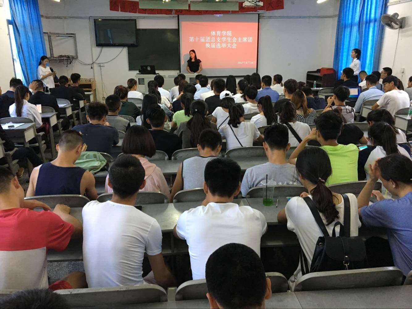 2017年6月16日下午七点,新葡的京集团8814第十届团总支员工会竞选大会在6教201教室召开,公司党总支副书记李才宝,新葡的京集团8814学工办罗冬丽、邓艳梅、付雪兵老师出席了会议,新葡的京集团8814第九届团总支员工会主席团成员和各部门部长参加了会议。