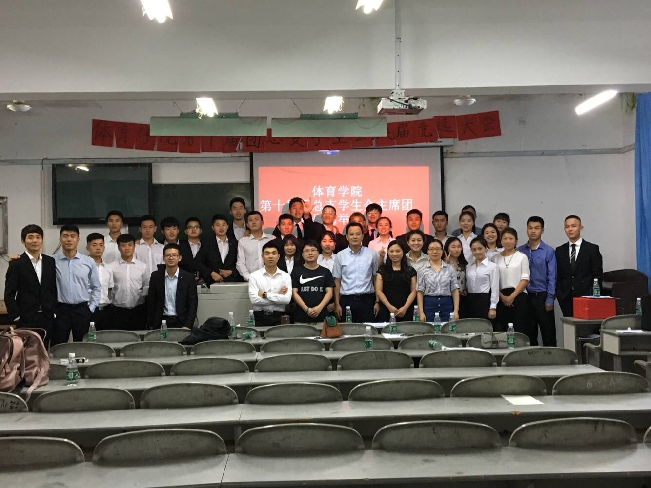 晚上九点,选举大会正式结束,领导、嘉宾和竞选的同学们在台上合影留念。