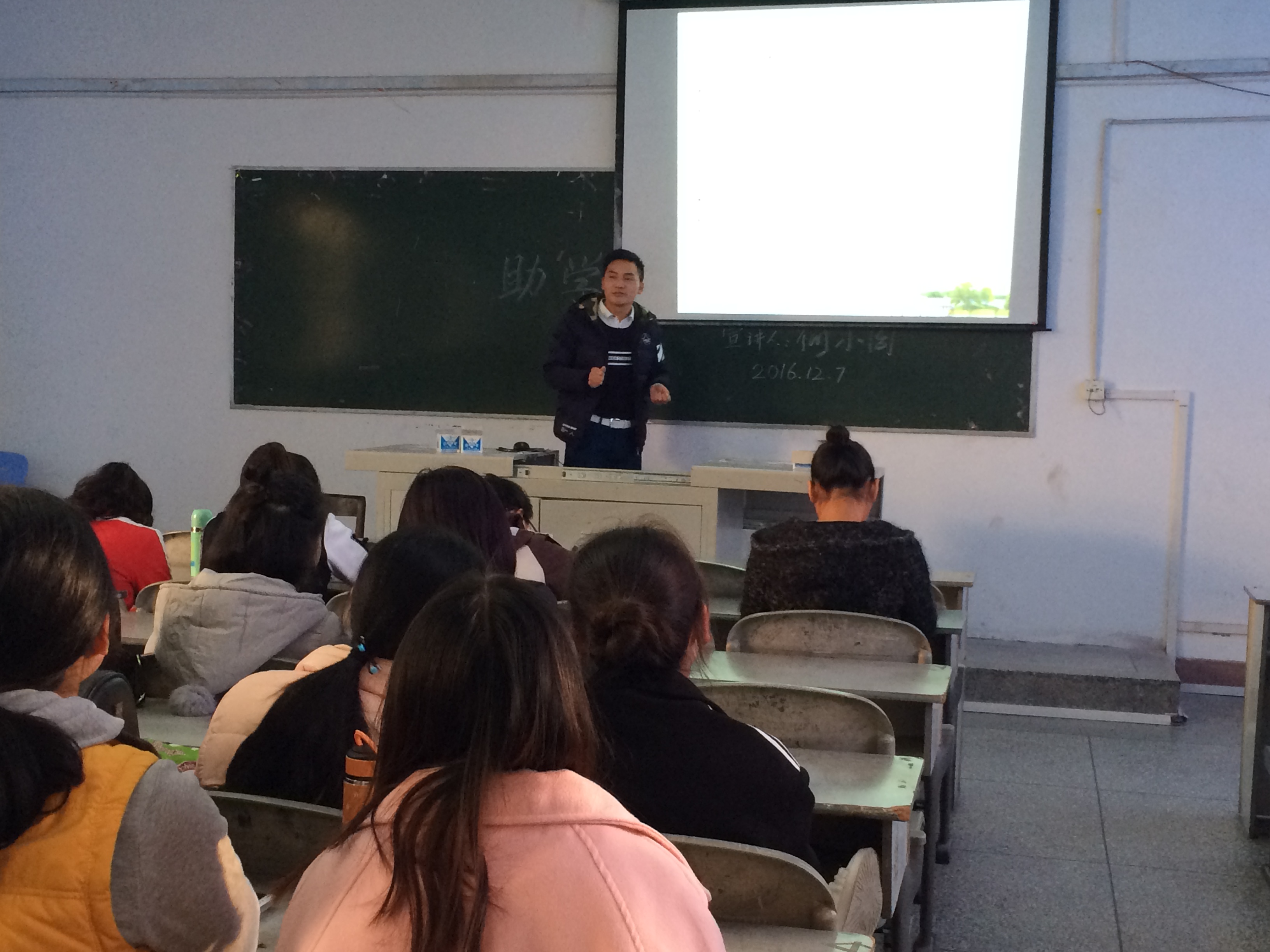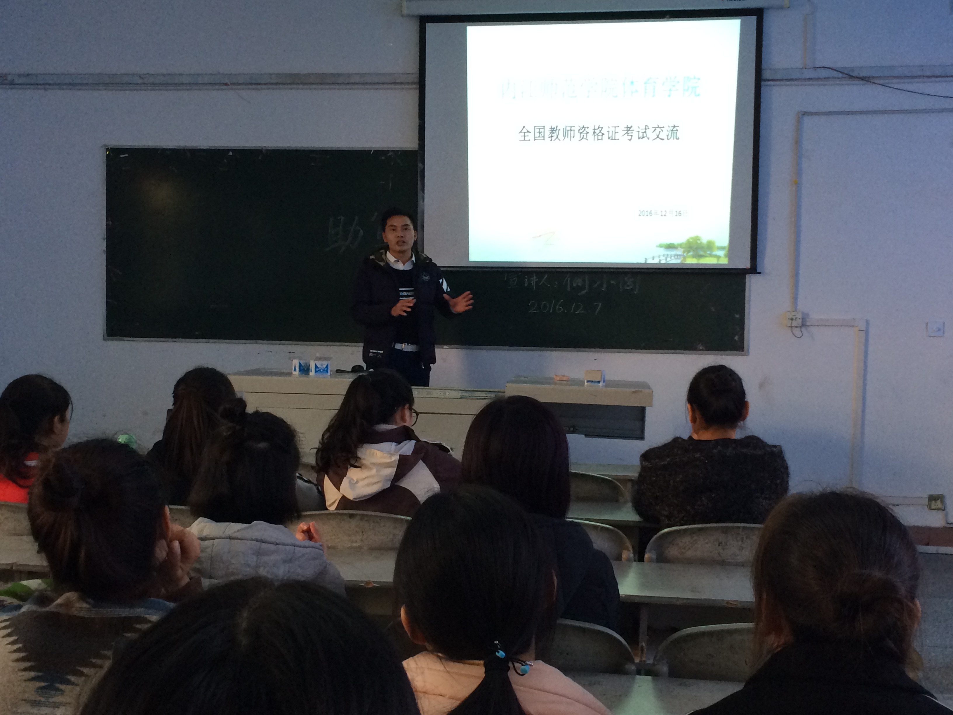 此次宣传活动结合非师范专业教团队格认定考试进行交流,目的是指导2014级社会体育指导与管理专业的同学们如何备战2017年11月的教团队格认定考试。何小周同学结合自己考试的经历,从笔试、面试以及资格认定三个大方面给同学们做了详细介绍,包括报考条件、报名流程、考试科目、网上缴费、面试地点、教案书写、备课等多方面的内容。